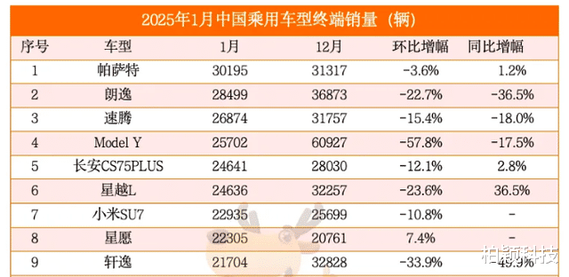 燃油车逆风翻盘,最大获益者却是外资车,1月份热销车型中前三名都是大众的,分别是帕萨特、朗逸、速腾,其中帕萨特是唯一月销量过3万的车型。
